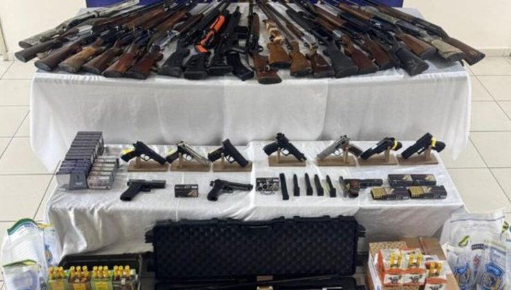 İkamet ve iş yerlerinde yapılan aramada 3’ü ruhsatsız 5 tabanca, 18’i ruhsatlı 20 tüfek, 5 kurusıkı tabanca, 1 havalı tüfek, 1 muşta, 1362 silah kartuşu ve 520 mermi ele geçirildi.