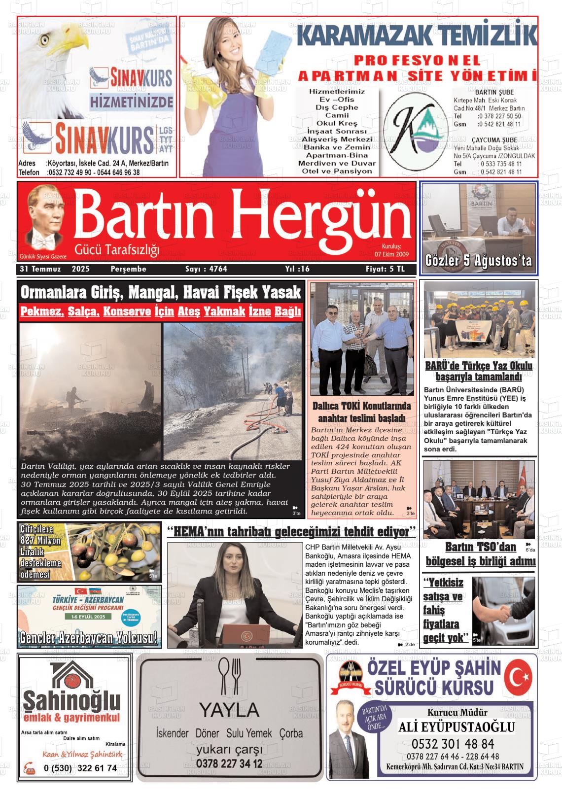 Bartın Yerel Gazeteleri 22 Kasım 2025, Cumartesi Günü Manşeti