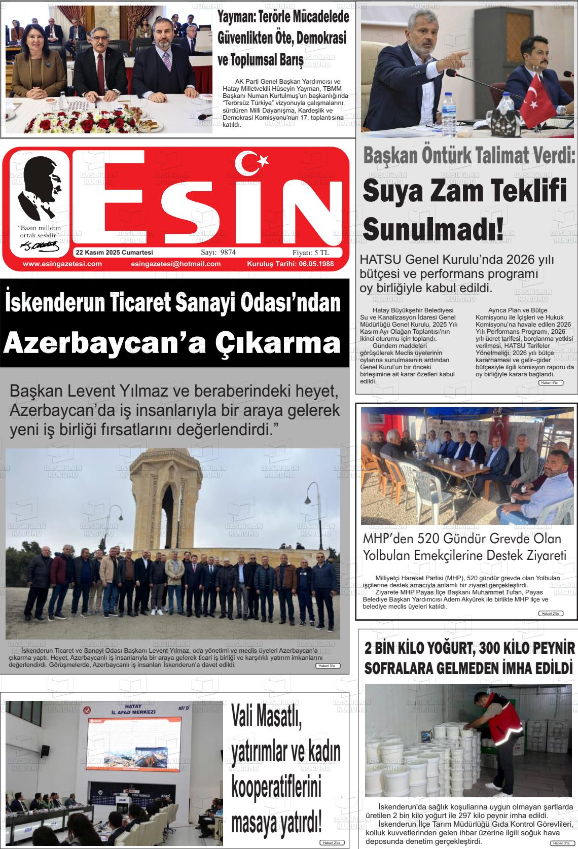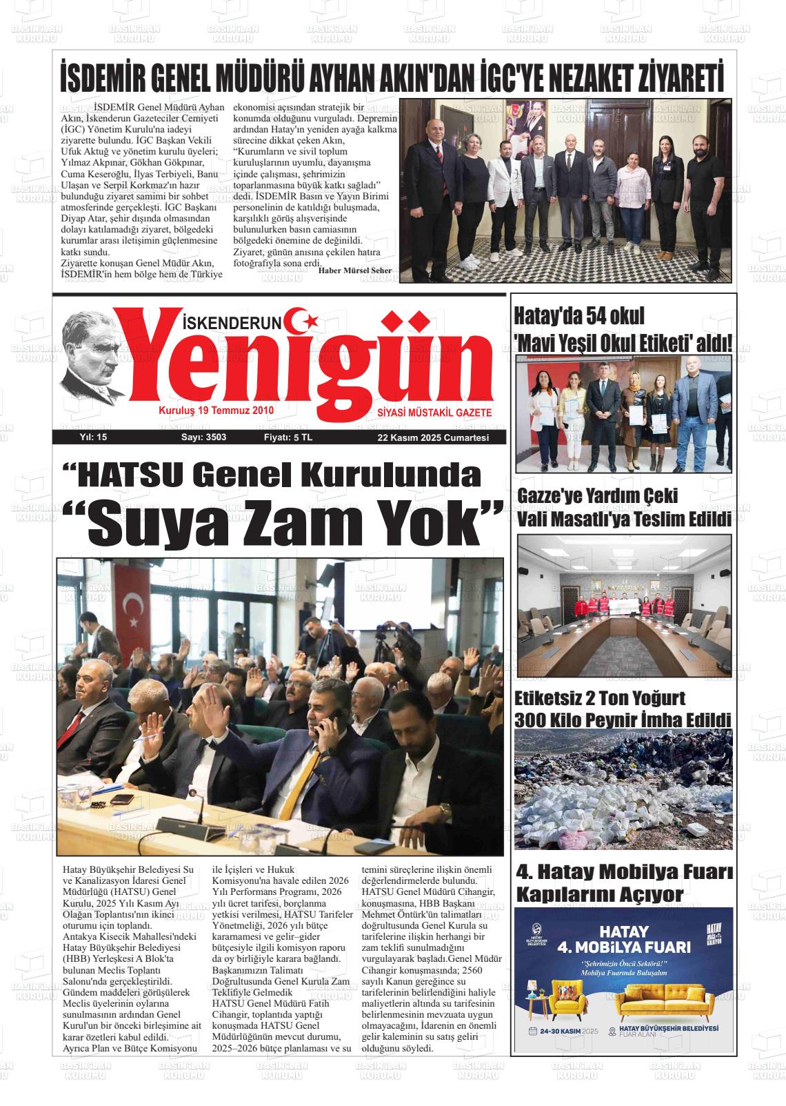 Hatay Yerel Gazeteleri 22 Kasım 2025, Cumartesi Günü Manşeti