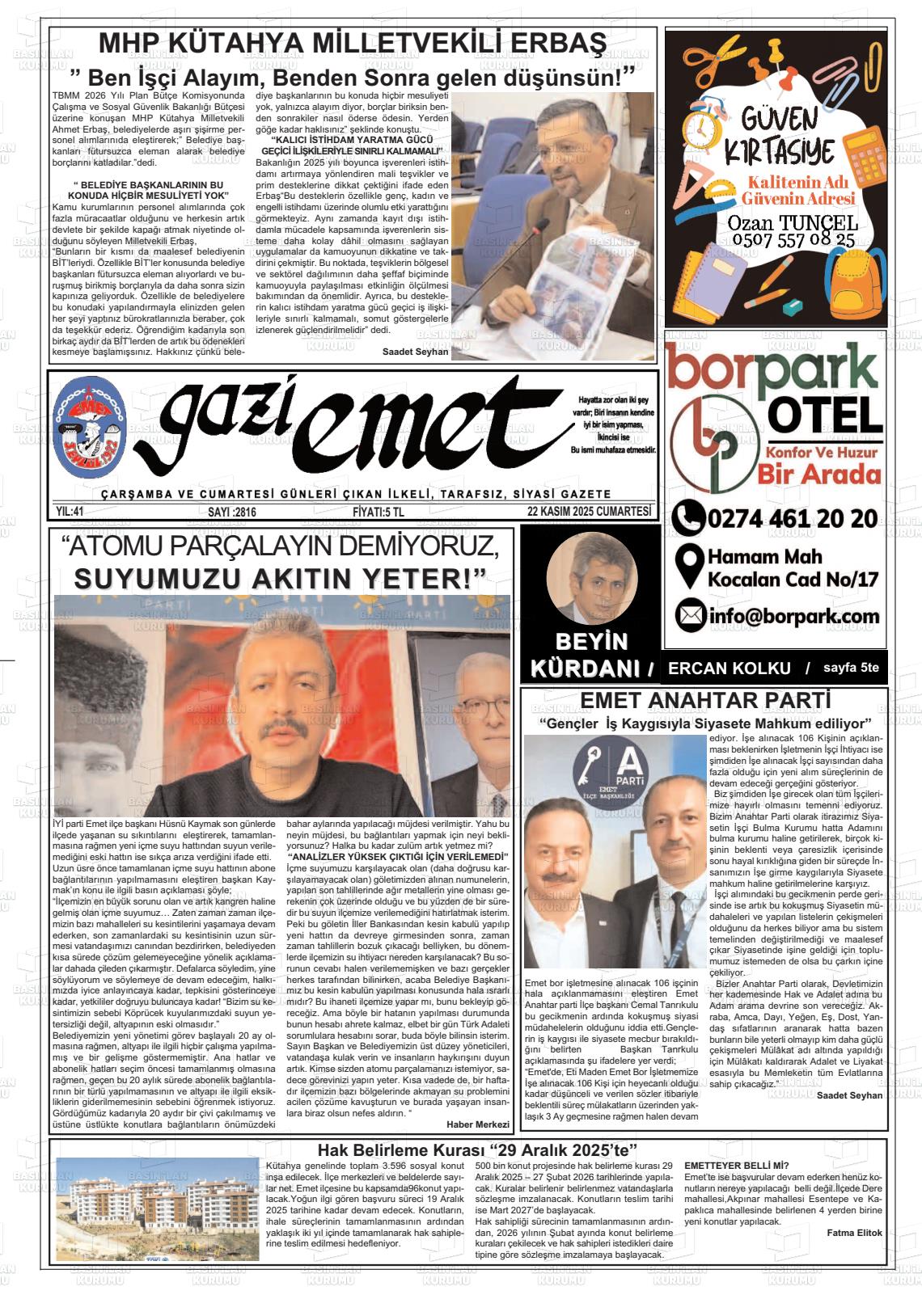 Kütahya Yerel Gazeteleri 22 Kasım 2025, Cumartesi Günü Manşeti