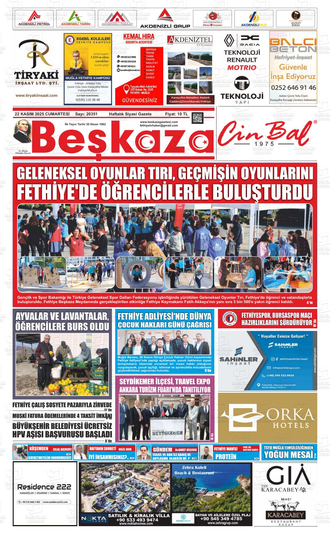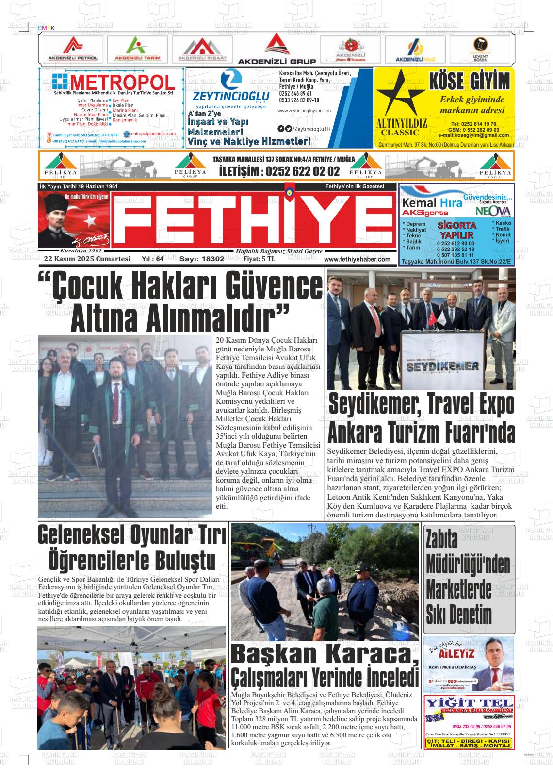 Muğla Yerel Gazeteleri 22 Kasım 2025, Cumartesi Günü Manşeti