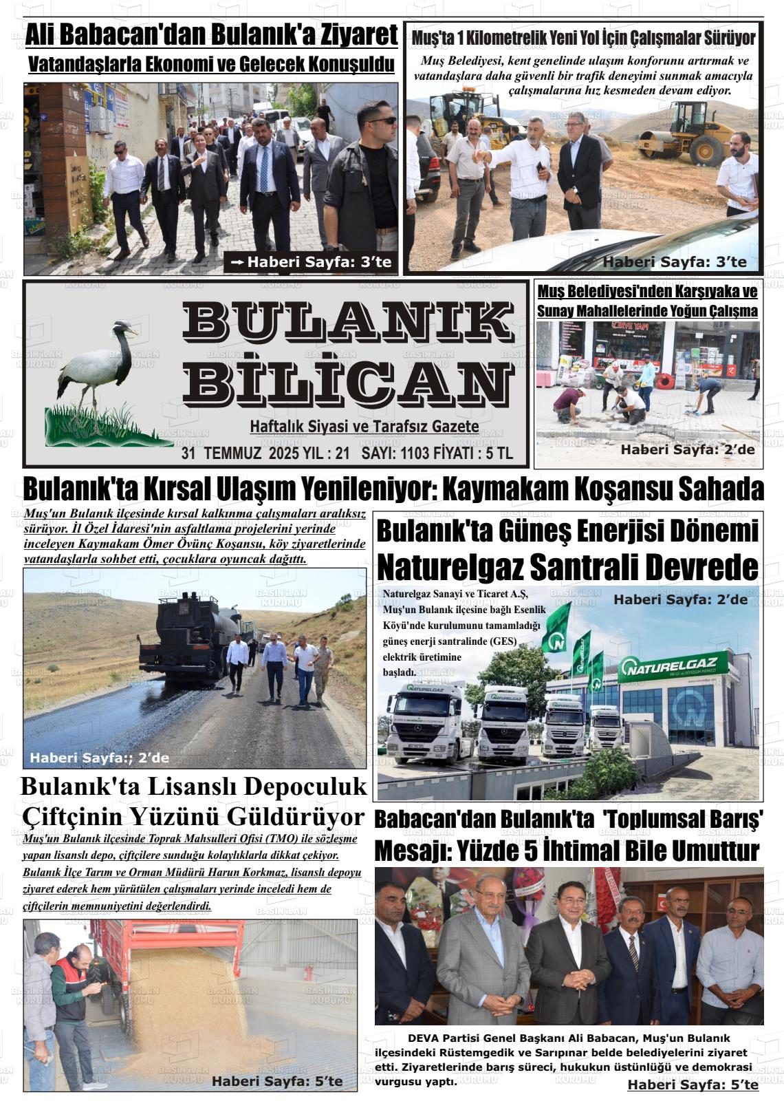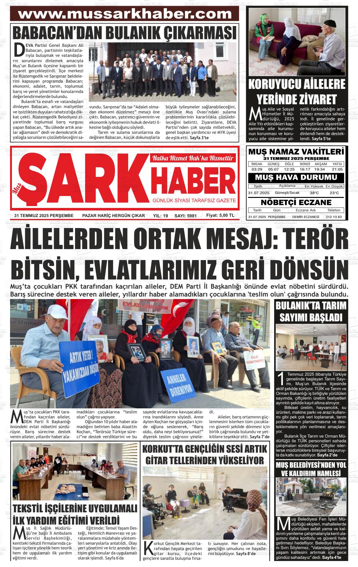 Muş Yerel Gazeteleri 09 Ocak 2026, Cuma Günü Manşeti