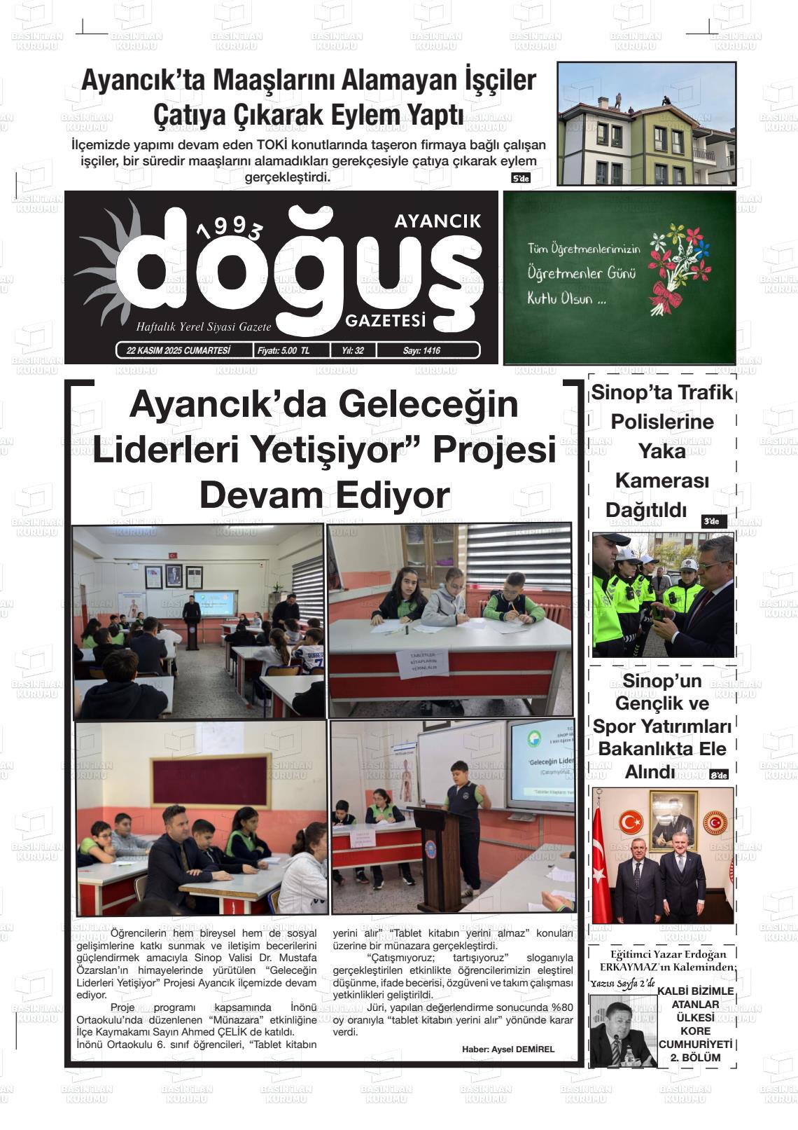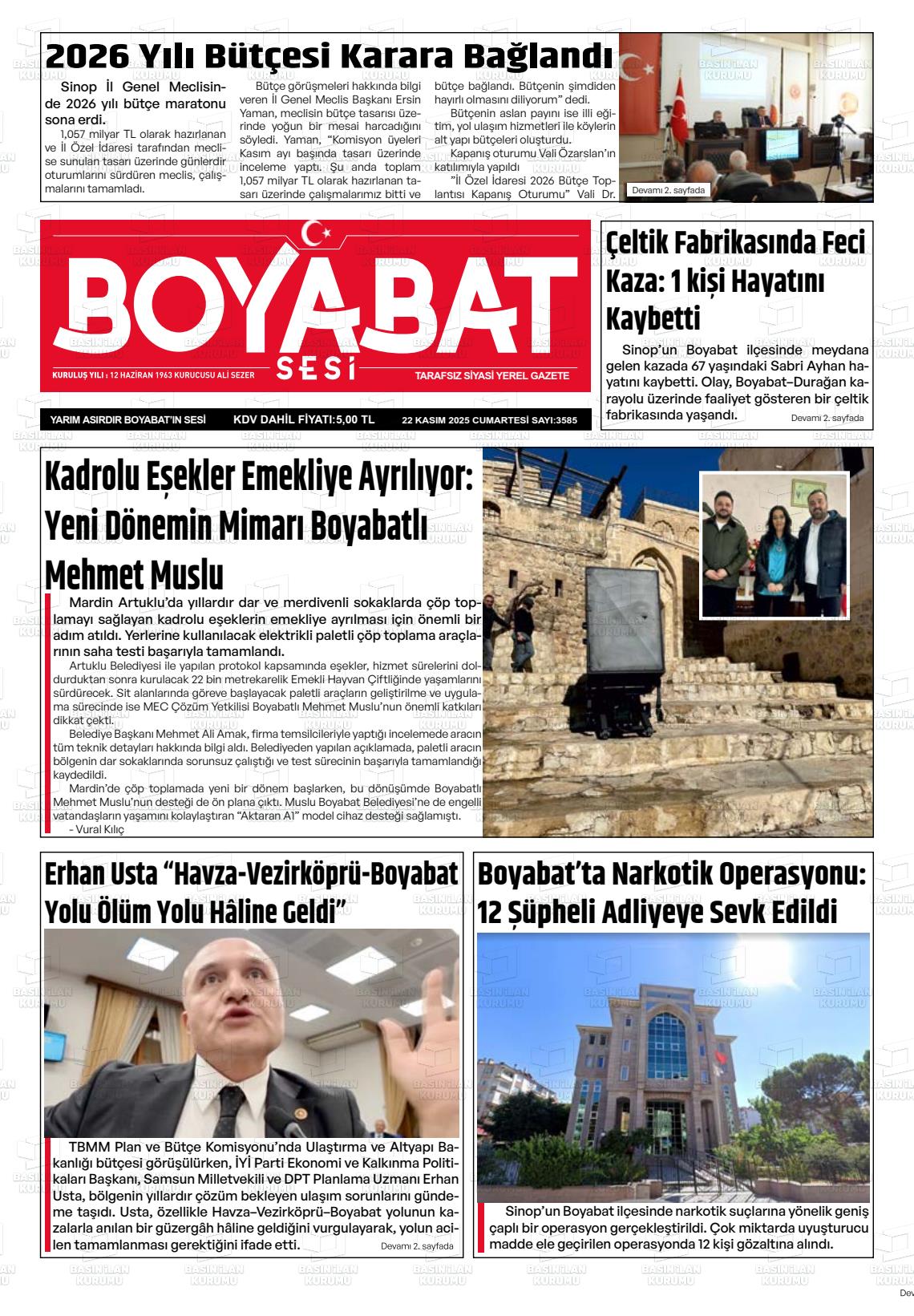 Sİnop Yerel Gazeteleri 22 Kasım 2025, Cumartesi Günü Manşeti
